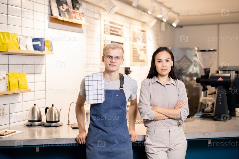 Два молодых работника современного кафе или ресторана стоят у рабочего места