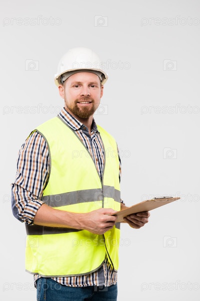 Веселый молодой мастер или инженер с букмекером, стоящий в изоляции