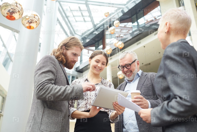 Улыбающиеся деловые люди в офисном зале