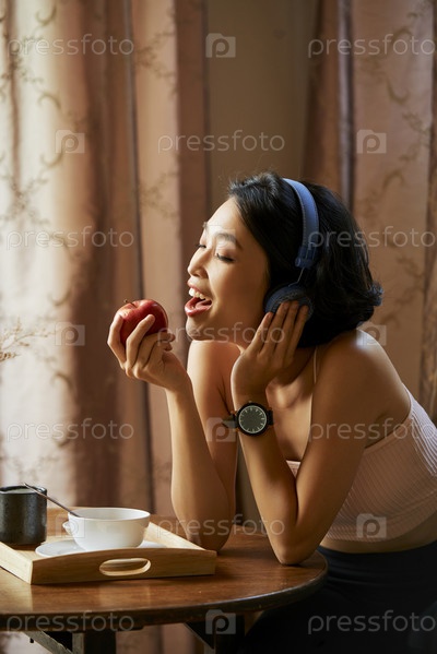 Красивая женщина ест сочное яблоко