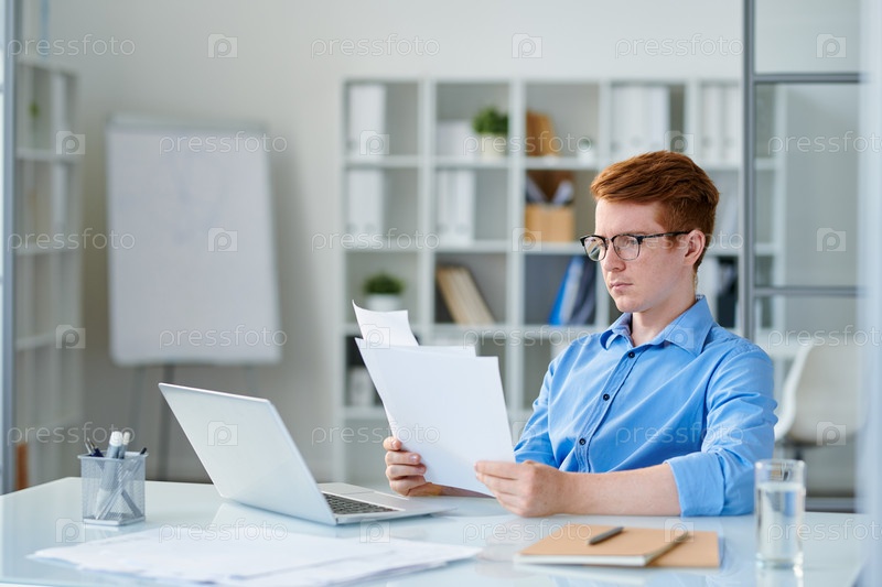 Молодой серьезный экономист или трейдер, читающий финансовые документы