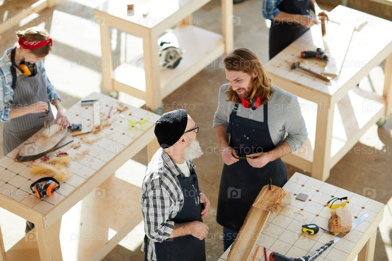 Вид сверху на позитивных коллег в фартуках, стоящих в столярной мастерской и обсуждающих деревянные изделия