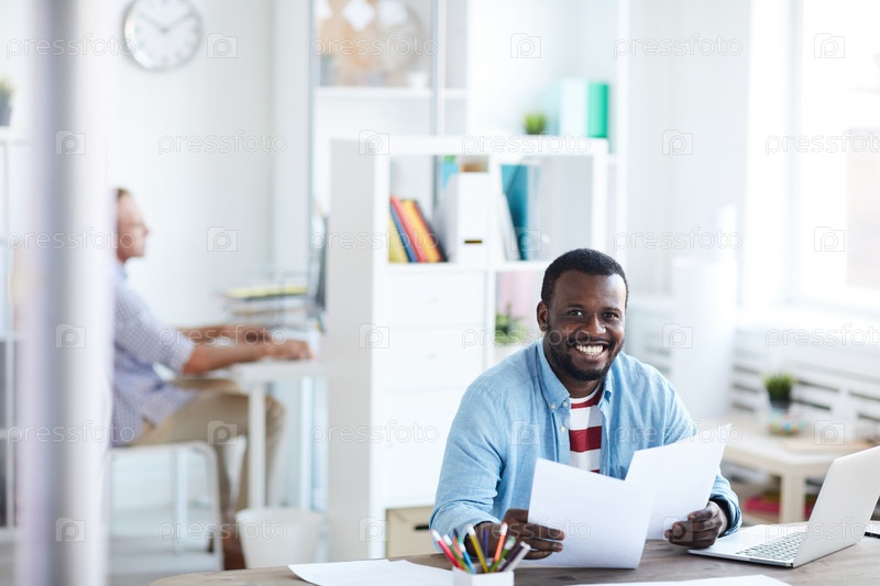 Счастливый, взволнованный уверенный молодой чернокожий менеджер в обычной рубашке сидит за столом и проверяет документы во время работы в современном офисе