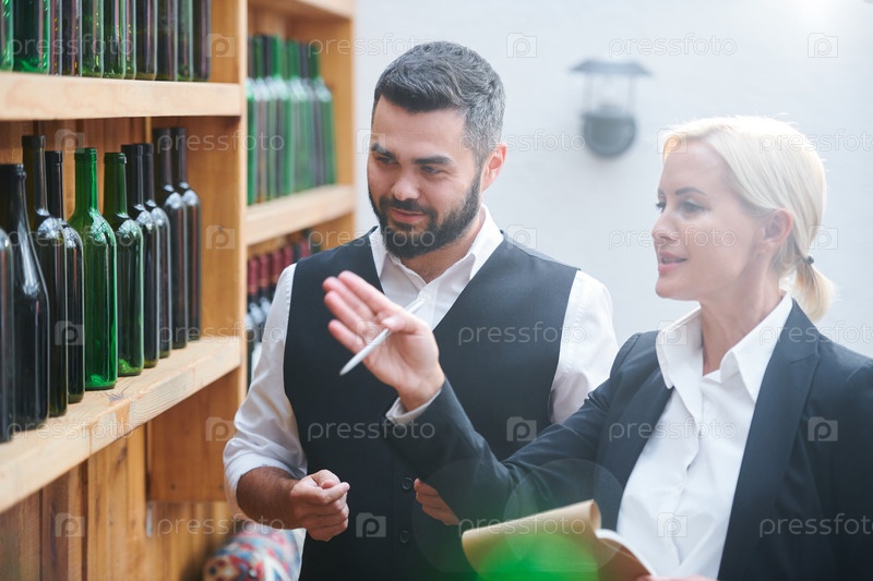 Уверенная в себе блондинка-соммелье и ее коллега обсуждают различные виды вина