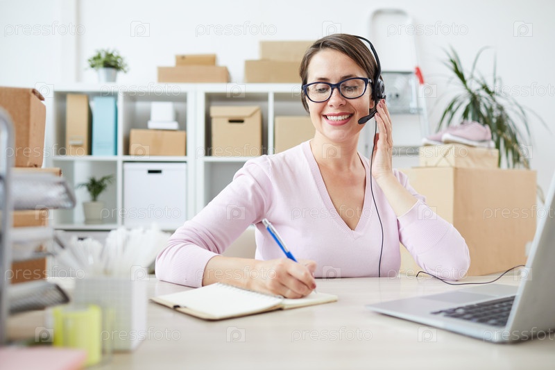 Молодой дружелюбный оператор колл-центра или интернет-магазина, делающий заметки