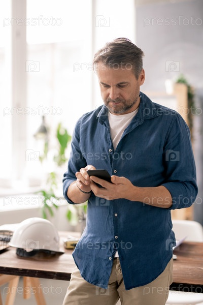 Современный мобильный инженер со смартфоном прокручивает контакты