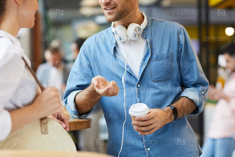 Близкий план мальчика-студента в синей рубашке, который жестикулирует руку и рассказывает историю своей девушке, проводя время в кафе