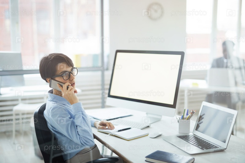 Современная бизнесвумен разговаривает по телефону на рабочем месте