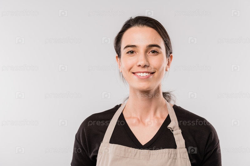 Красивая молодая брюнетка-официантка в фартуке смотрит на тебя с зубчатой улыбкой