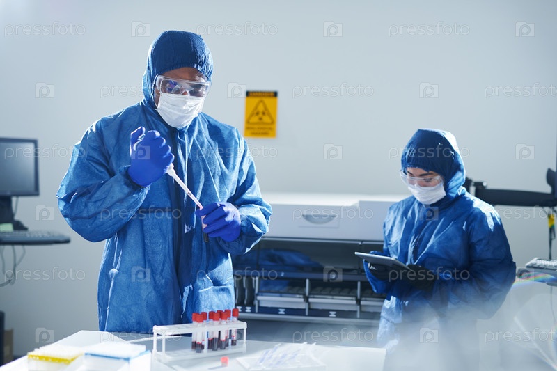 Вирусолог в защитной рабочей одежде занят образцами