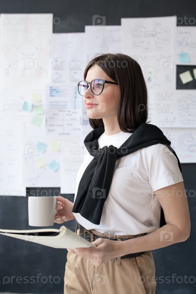 Молодая деловая женщина с напитком и копирайтером, готовящаяся к семинару