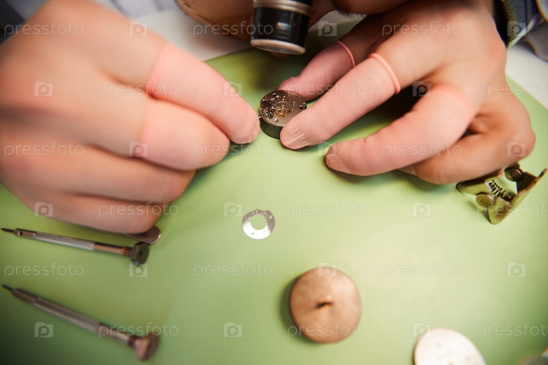 Близкий план неузнаваемого работника в монокулярной увеличительной лупе на глазу, работающего на небольшом редукторе механических часов