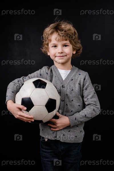 Счастливый мальчик в повседневной одежде, держащий футбольный мяч за грудь в изоляции