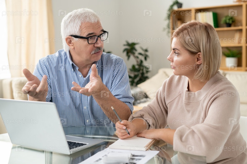 Уверенная в себе деловая женщина и ее старший коллега-мужчина обсуждают рабочие моменты