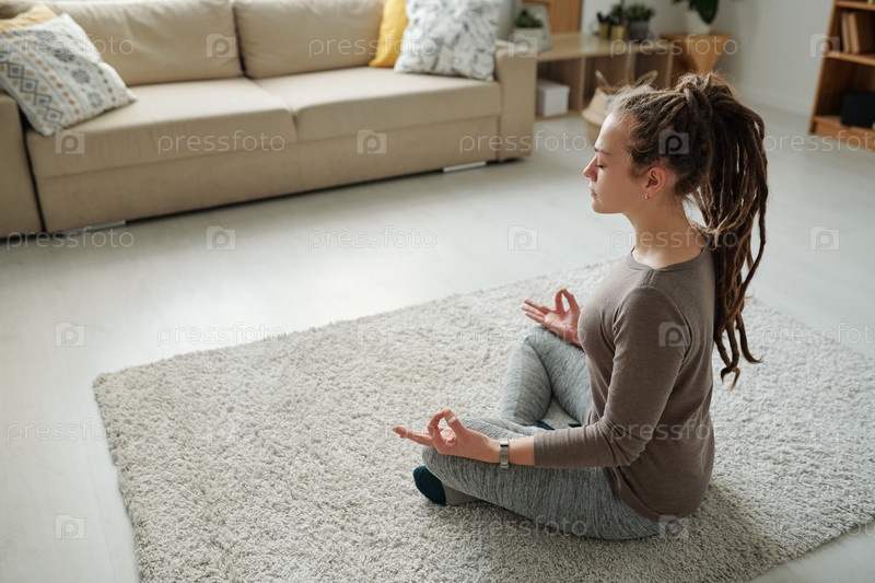 Девушка в спортивной одежде слушает, сидя в позе лотоса на ковре во время медитации