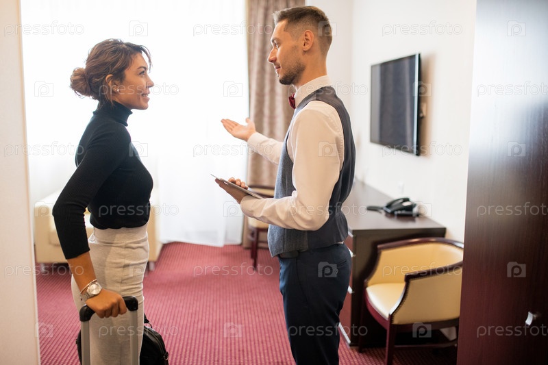 Молодой привратник в форме показывает комнату одному из гостей с багажом