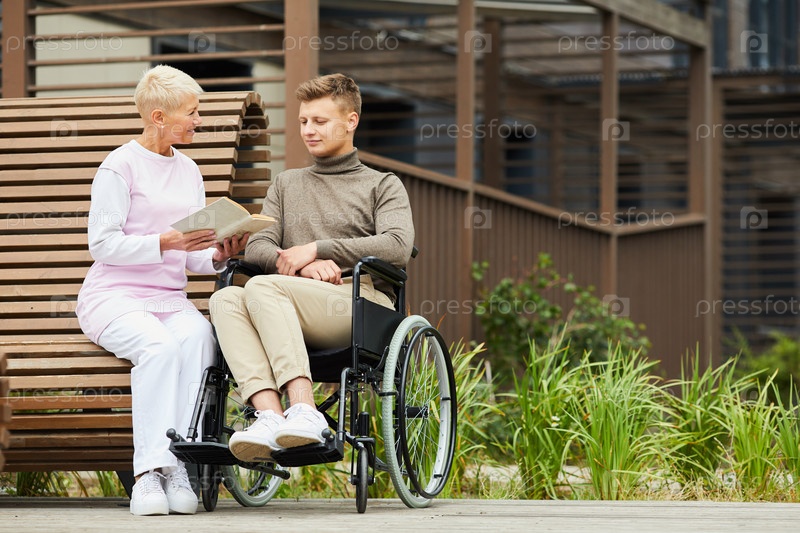 Красивый молодой человек сидит в инвалидной коляске и слушает рассказ, читаемый медсестрой во время прогулки, он восстанавливается после травмы в реабилитационном центре