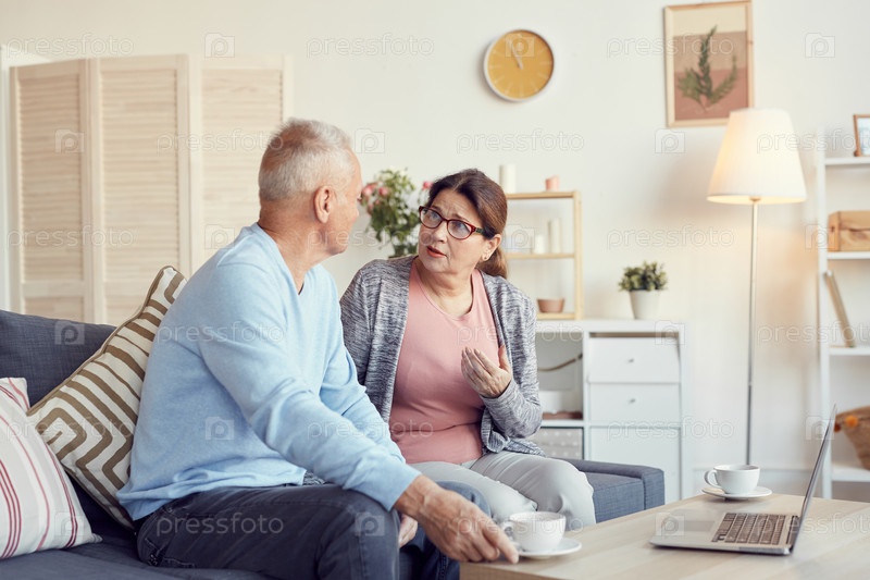 Обеспокоенная зрелая леди в очках сидит на диване дома и жестикулирует рукой, разделяя свои страдания с мужем