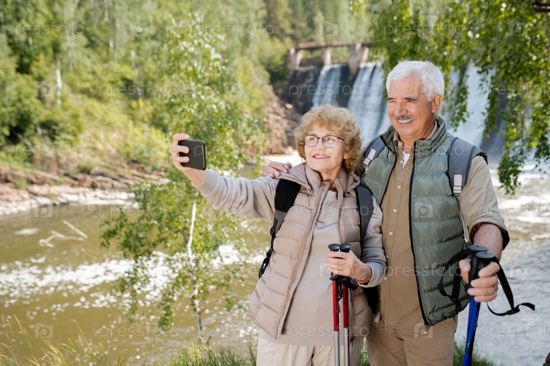Улыбающиеся пожилые люди с троллейбусовыми палочками делают селфи во время поездки