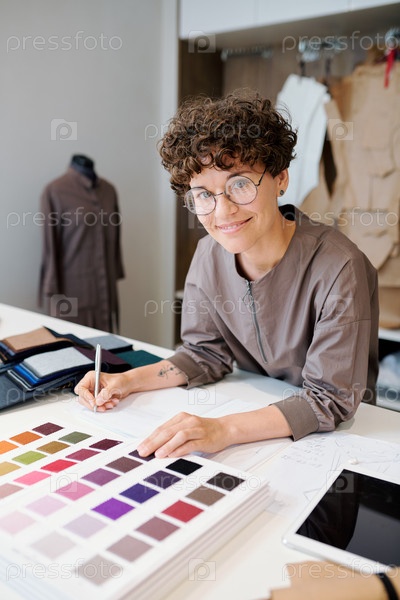 Молодой дизайнер делает заметки и просматривает каталог образцов текстиля