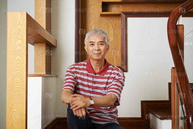 Азиатский мужчина сидит на лестнице дома