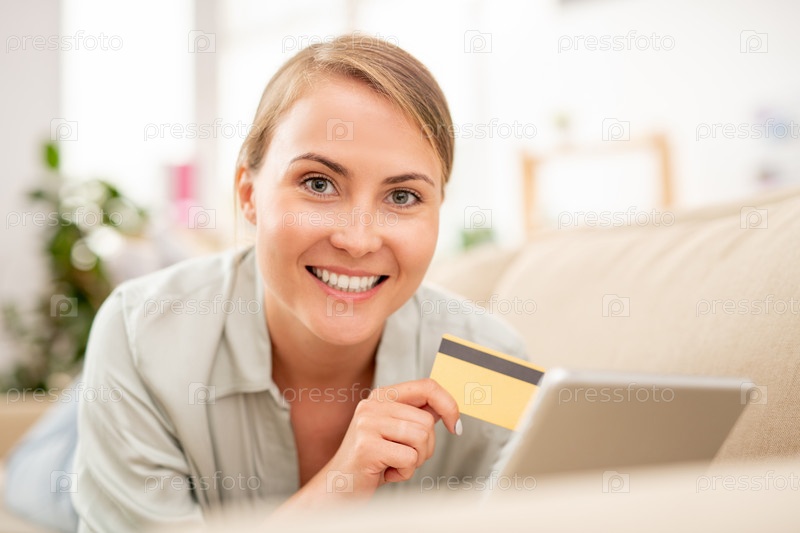 Молодой интернет-покупатель с пластиковой картой и сенсорным панелем делает заказ на диване