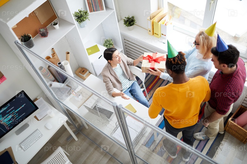 Высокоугольный вид мультиэтнических коллег в партийных шляпах, дающих подарки женщине с днем рождения, поздравляя ее в современном офисе