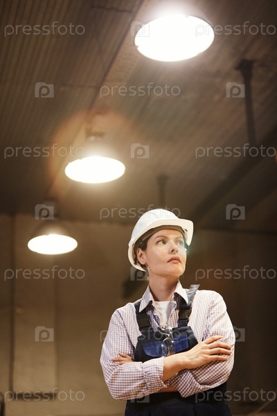 Серьезная уверенная молодая женщина в рабочей одежде и хардхете, стоящая во тёмном фабричном магазине с включенными лампами и смотрящей на расстояние