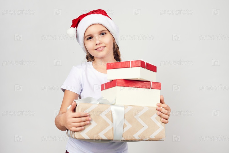 Портрет улыбающейся красивой девушки в шляпе Санты, стоящей на изолированном фоне и держащей кучу рождественских подарков