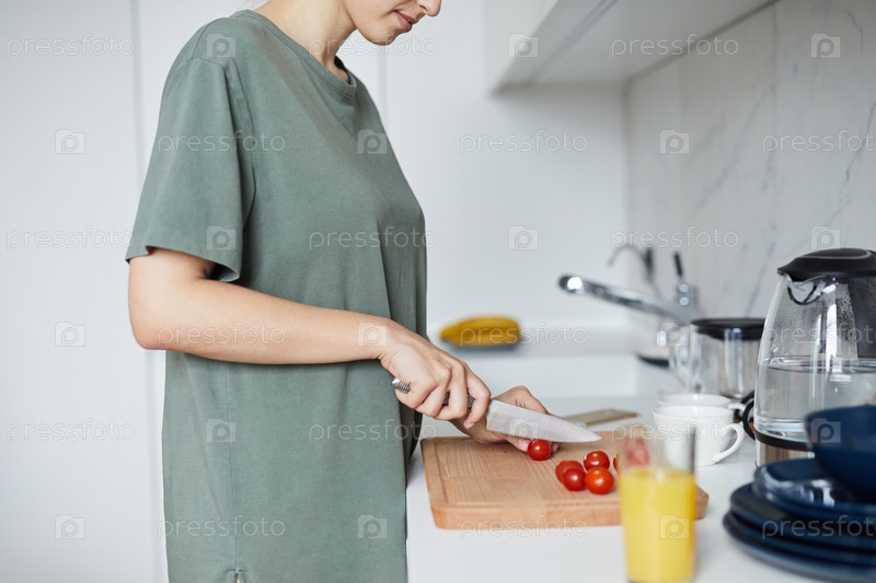 Молодая домохозяйка с ножом режет красные помидоры на деревянной доске