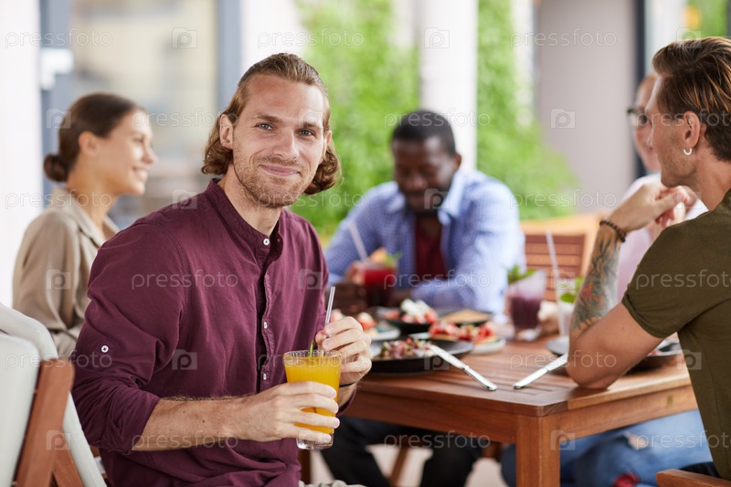 Красивый мужчина наслаждается обедом с друзьями в кафе
