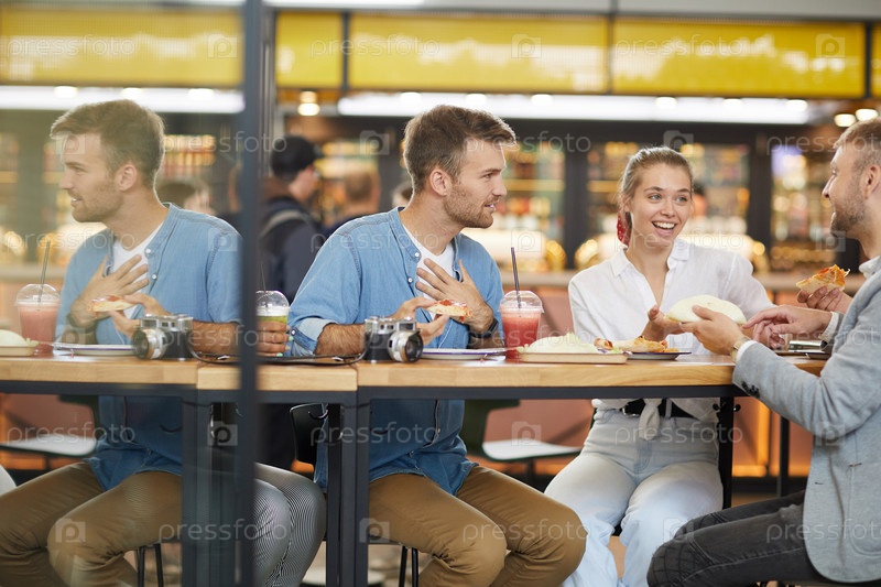 Веселые эмоциональные молодые люди, сидящие за высоким столом и разговаривающие во время еды фаст-фуда в современном кафе