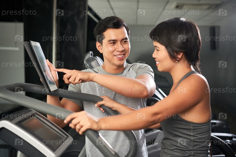 Фитнес-тренировщик помогает клиенту