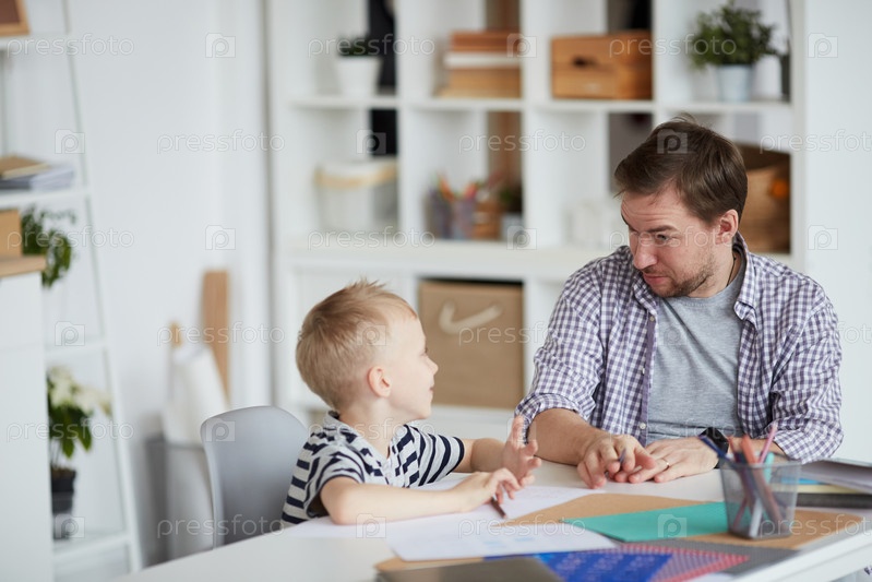 Удивленный молодой отец с нахмуренным лбом сидит за столом и обсуждает творческое задание школы со своим сыном