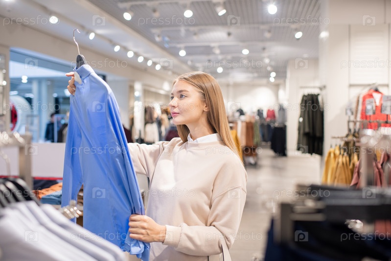 Случайная блондинка смотрит на синюю рубашку в отделе одежды