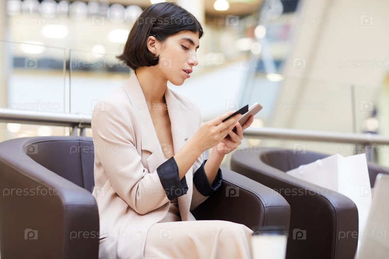 Красивая женщина, использующая мобильное приложение в торговом центре