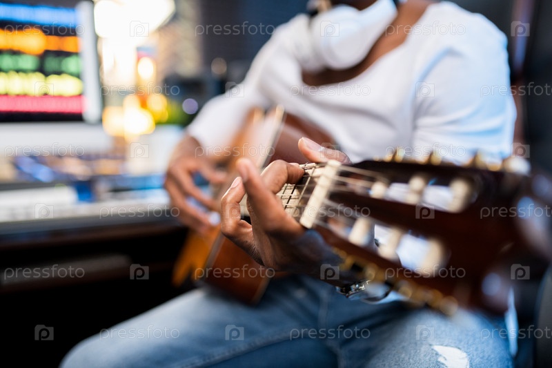 Руки молодого музыканта африканской этнической принадлежности на струнах акустической гитары