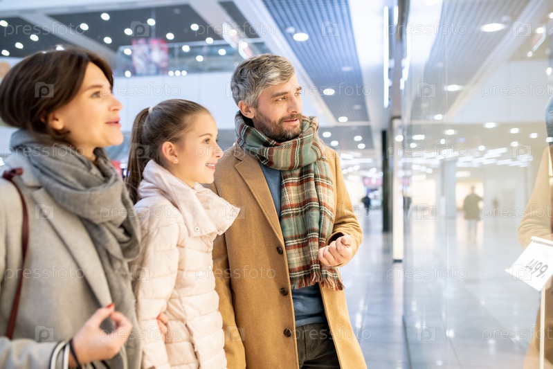 Веселая семья матери, отца и дочери смотрит на сезонную коллекцию