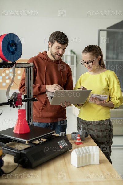 Молодой инженер с ноутбуком и его красивая коллега обсуждают новые идеи