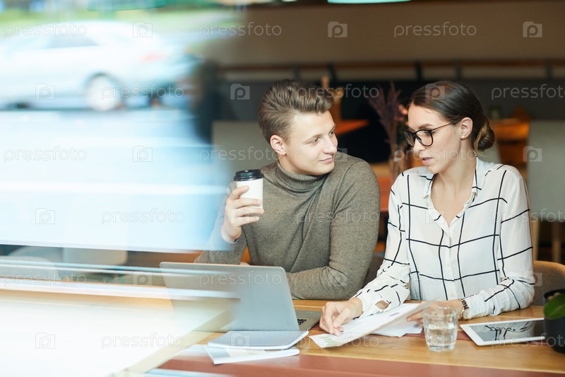 Вдумчивые молодые коллеги по бизнесу в умной повседневной одежде сидят за столом в кафе и просматривают газеты, обмениваясь идеями о стратегии
