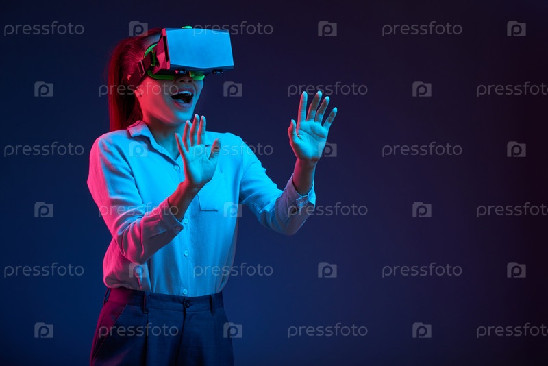 Веселая бизнес-леди в очках VR