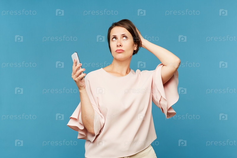 Молодая женщина со смартфоном, спекулирующая о промо