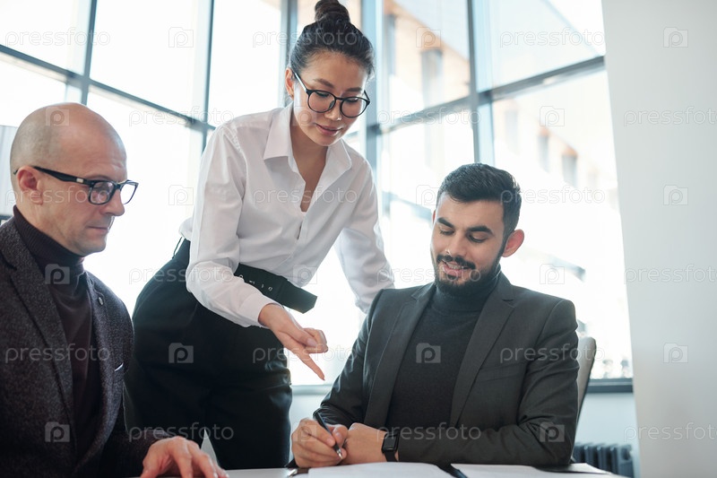 Молодой агент указывает на контракт, объясняя его условия бизнес-партнеру