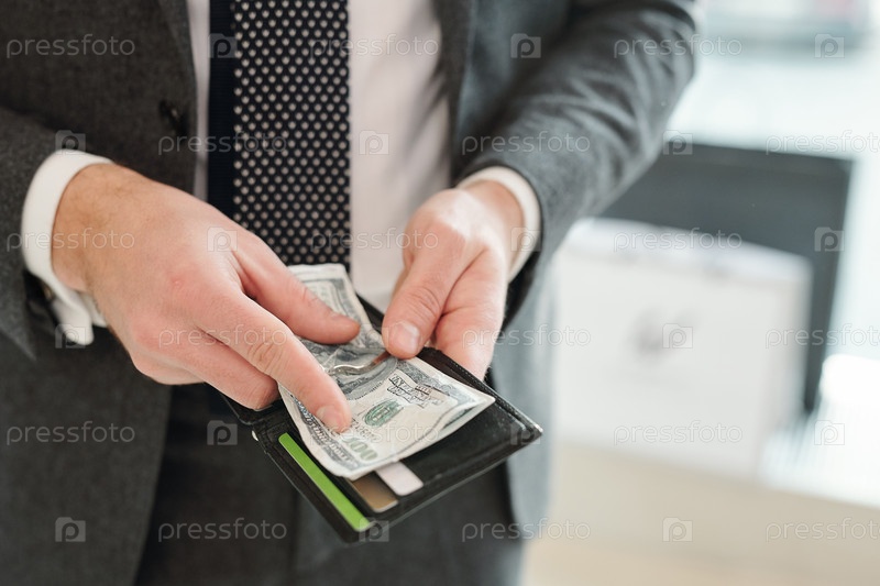 Руки богатого элегантного бизнесмена в костюме, держащего кошелек и долларовые банкноты