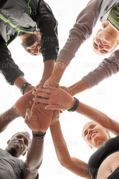 Группа молодых межкультурных чемпионов в активной одежде, делающих кучу рук
