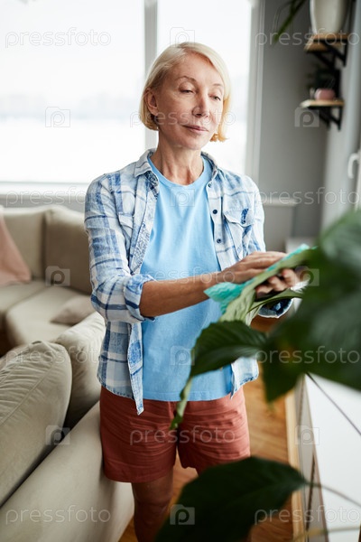 Привлекательная женщина ухаживает за комнатным растением