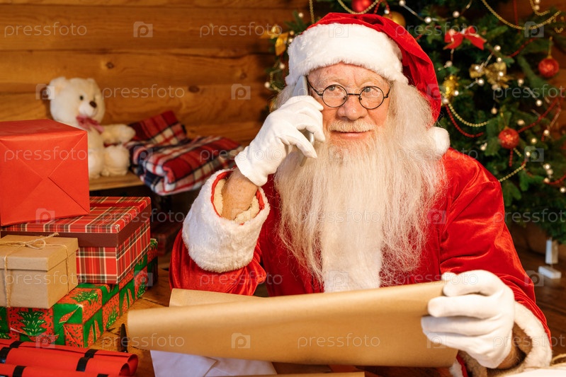 Санта в костюме, перчатках и очках держит развернутую бумагу с детскими именами