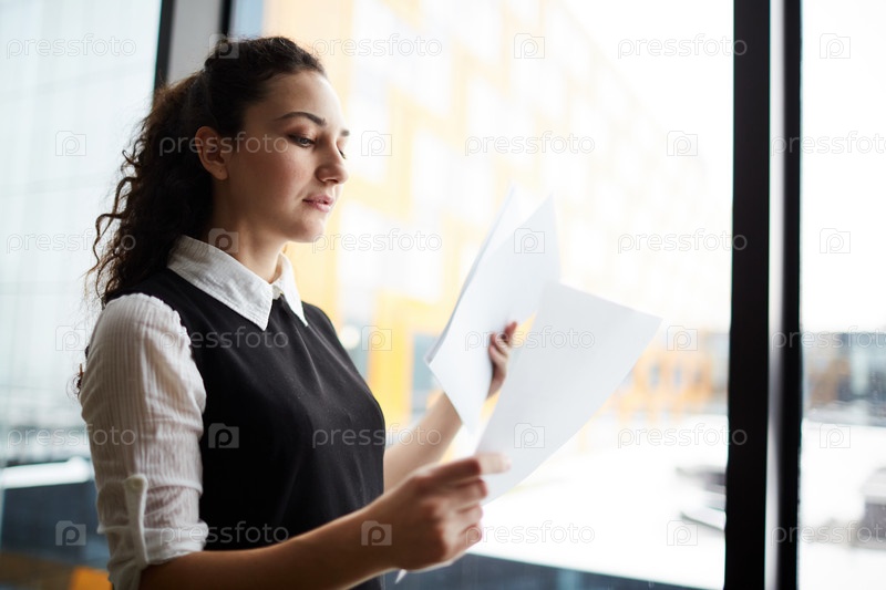 Красивая формальная женщина читает бумаги при дневном свете