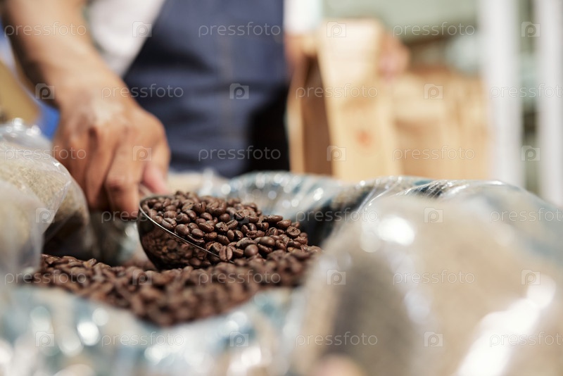 Черные кофейные бобы на фабрике