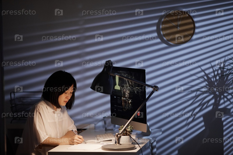 Деловая женщина, выполняющая свою работу до поздней ночи